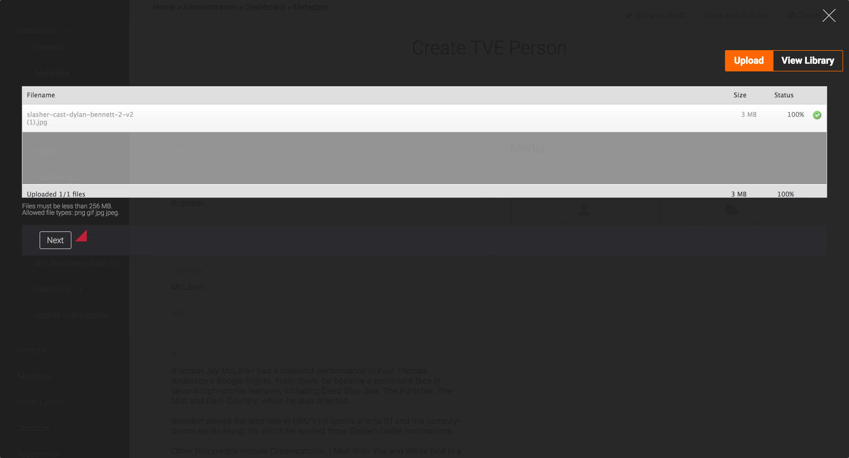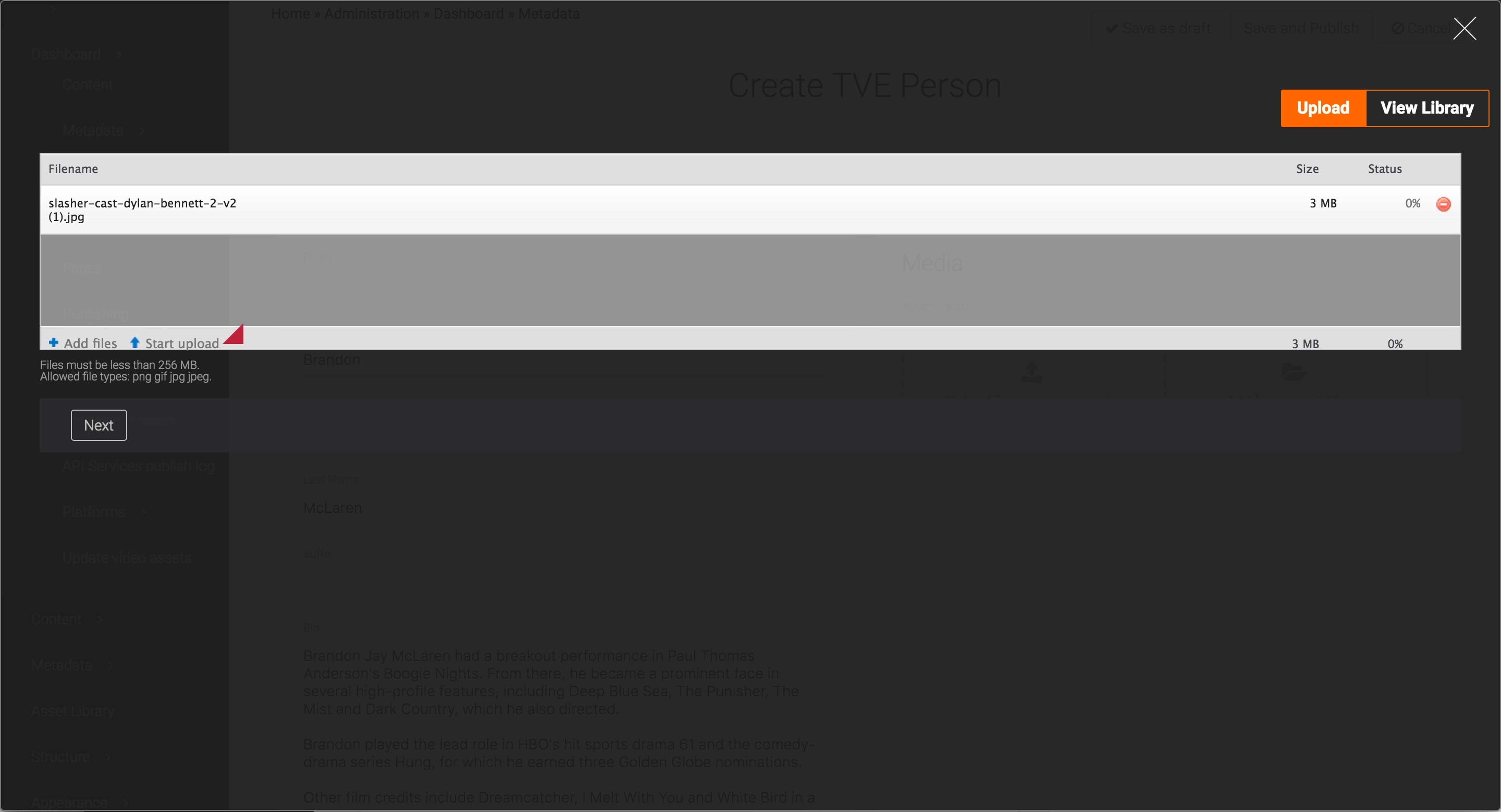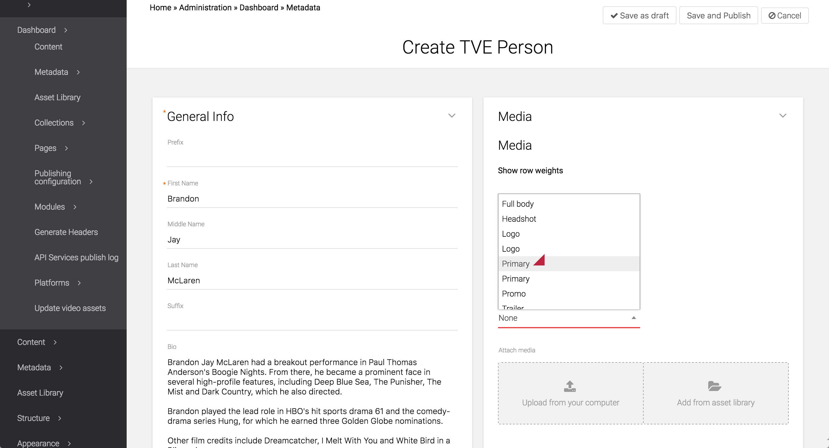 Open the Media card and upload or select the logo, main image, and the trailer. Set the usages to Logo, Primary, and Trailer, respectively. The Primary image will appear as the tile image of the Marathons & Events Landing page.
